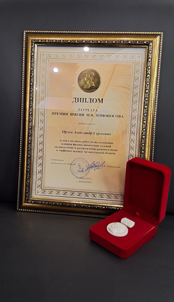 В числе награждённых в номинации «Молодые учёные» – научный сотрудник лаборатории болотных экосистем Лавёровского центра, кандидат геолого-минералогических наук Александр Орлов. Он удостоен премии имени М.В. Ломоносова Правительства Архангельской области и Ломоносовского фонда за цикл научных работ по исследованию влияния физико-химических условий на накопление и распределение радионуклидов в торфяных залежах Архангельской области.
