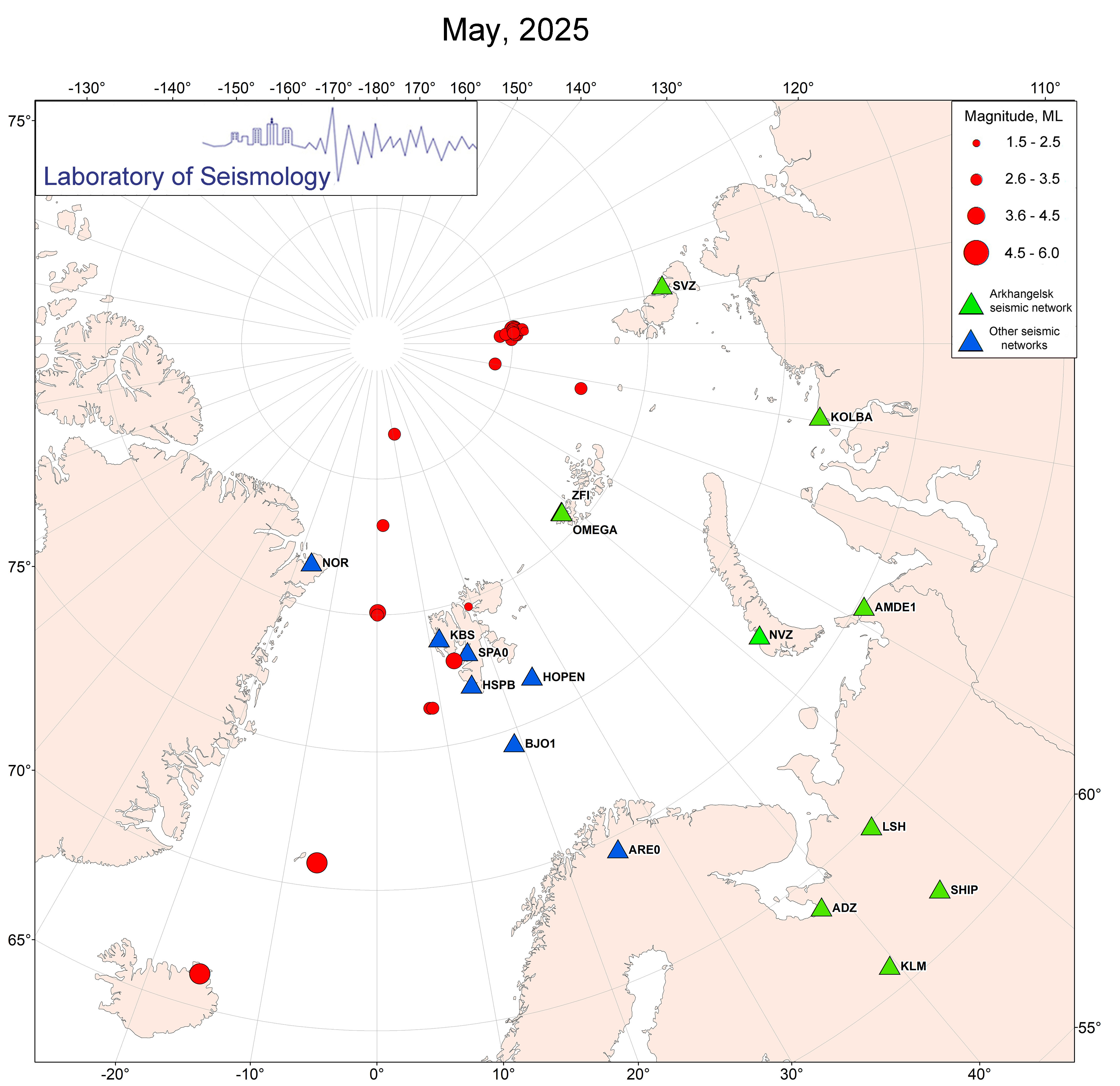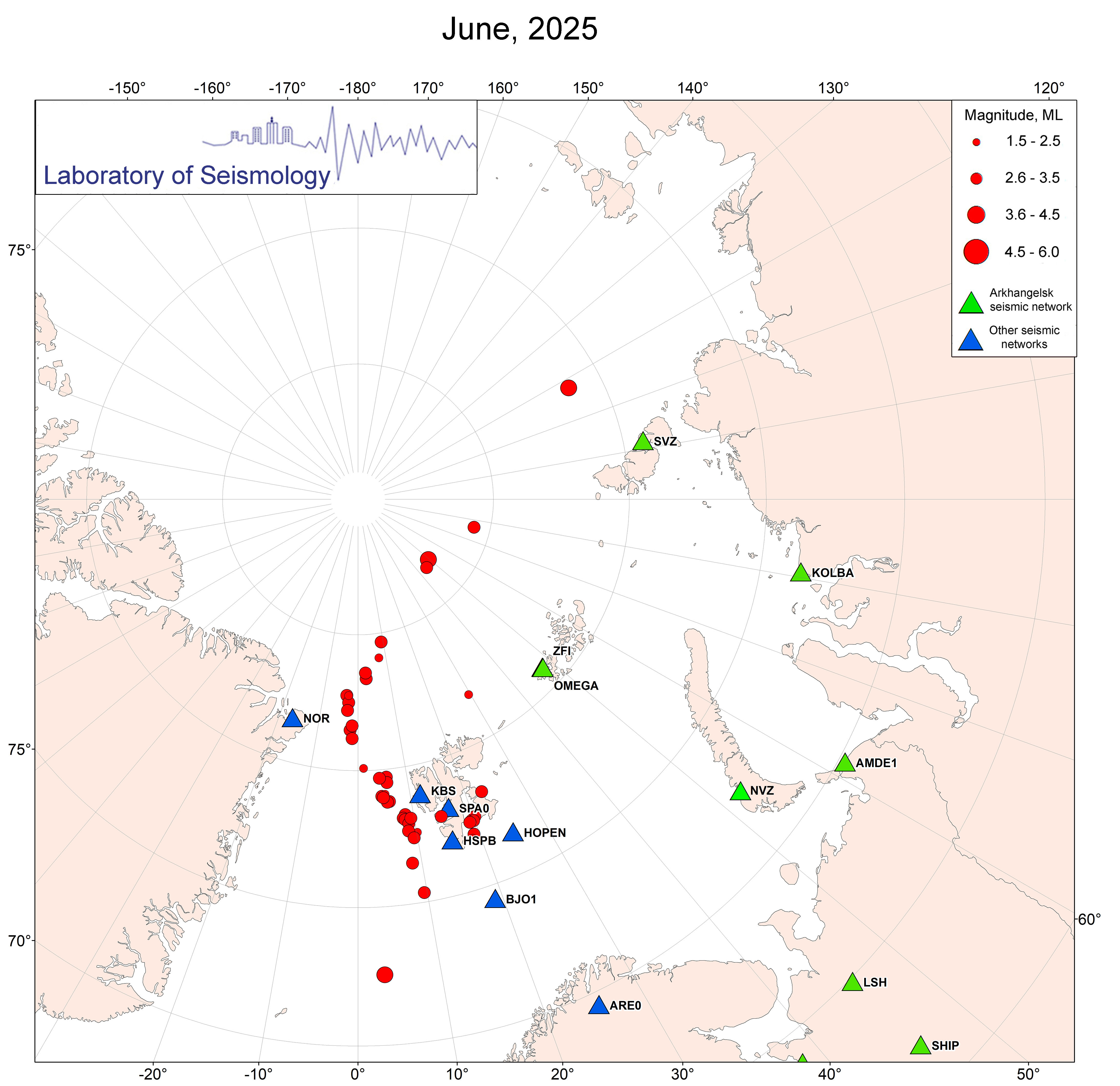 Результатом проведения сейсмического мониторинга является создание регионального бюллетеня, каталога и построение ежемесячных карт сейсмических событий произошедших в Евро-Арктическом регионе. Бюллетень создается каждые 10 дней, каталог – ежемесячно. Карты сейсмических событий представлены ниже.